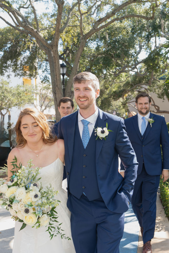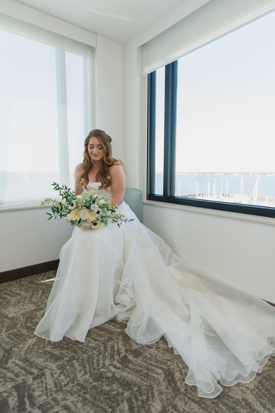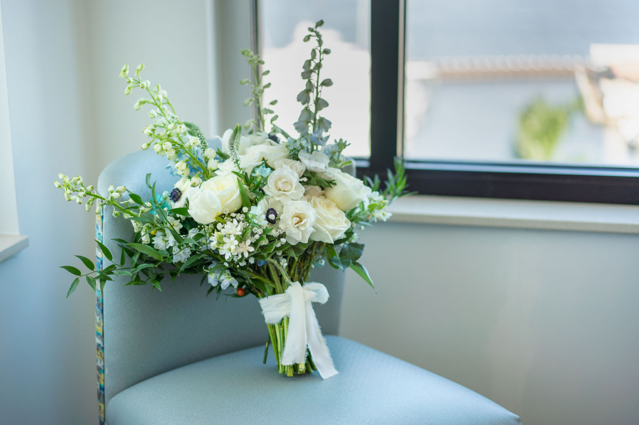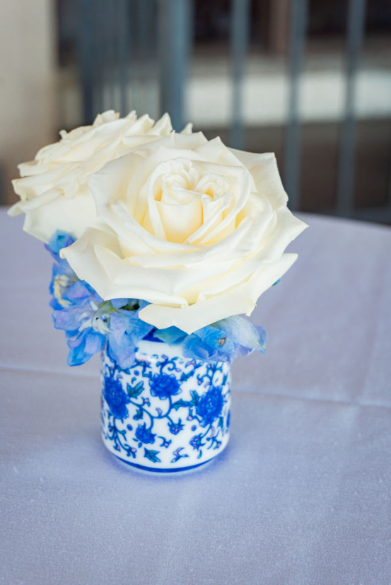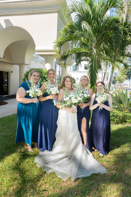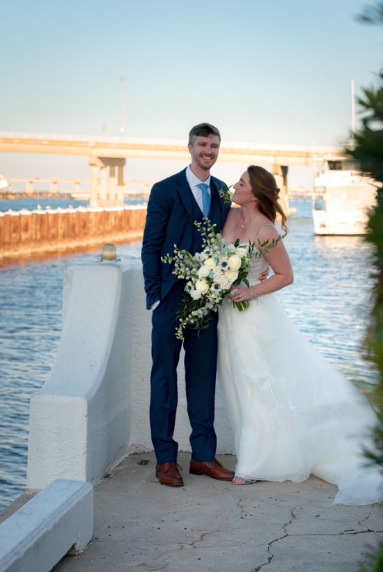 Amber and Sam exchanged vows at the lovely Pier 22 restaurant located in Bradenton - with stunning marina views and water views their wedding was a celebration of elegance paired with romantic florals. Bride choice of flowers - light blue delphiniums, black and white anemones, delicate spray roses, veronica and tweedia. Their ceremony took place in the lovely outdoor garden at the restaurant and the celebration continued in a private room with lovely touches of decor with blue and white accents and florals.