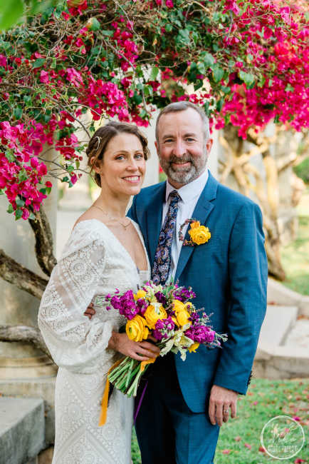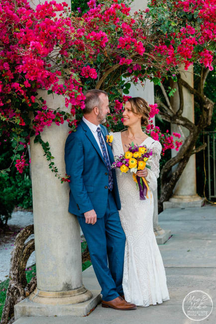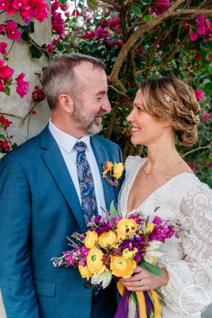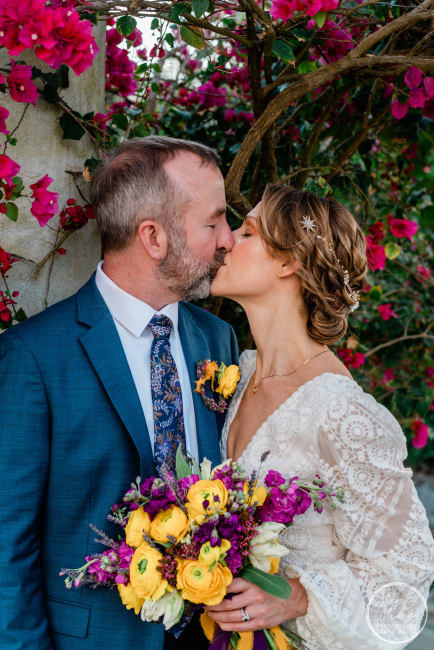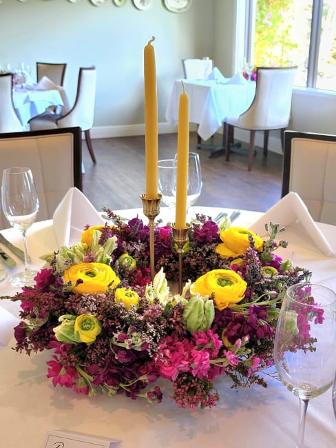 Jeff & Heather's wedding at the Historic Spanish Point was a picturesque celebration, perfectly blending elegance and nature. The Spanish Point chapel adorend with lovely mirrored columns with two stunning focal floral arrangements, each brimming with vibrant yellow clooni ranunculus, blooming forsythiga, fragrant stock, parrot tulips and fresh heather, creating a warm atmosphere. The couple's unique centerpieces were a highlight of the decor crafted in the shape of elegant wreaths that symbolized everlasting love. At the center of each wreath, beeswax candled flickered softly casting a warm glow and enhancing the romantic ambiance and celebration.