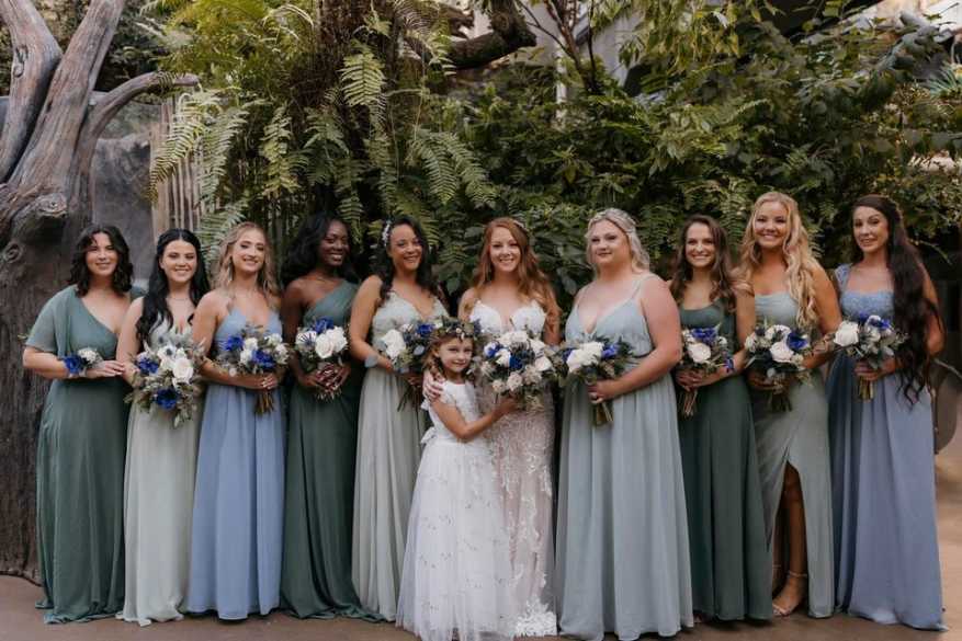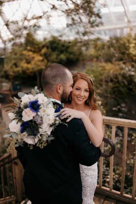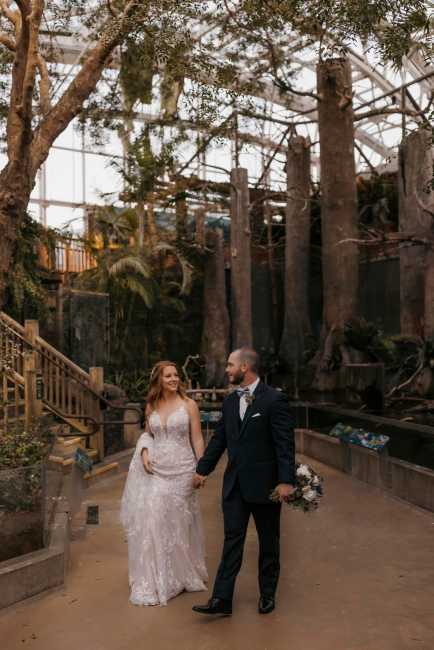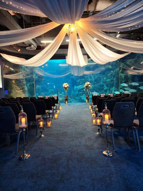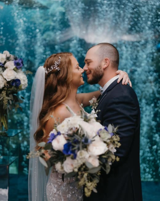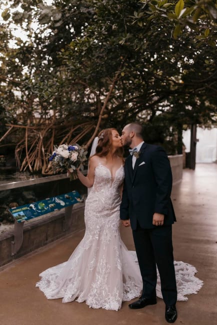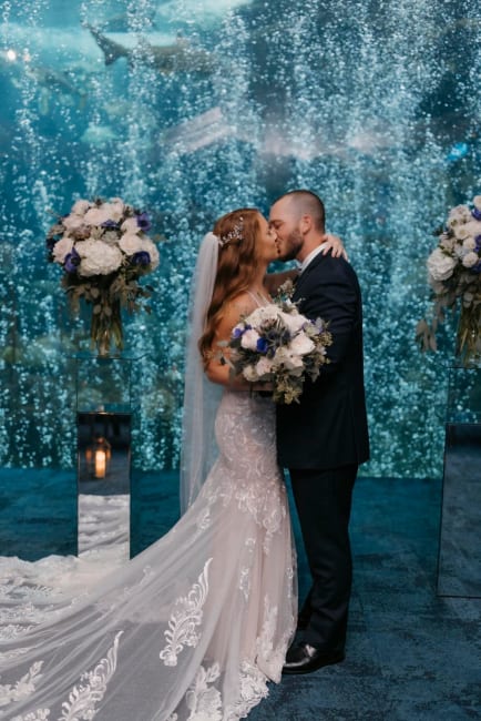 Julie & Jason booked a magical venue - the Florida Aquarium in Tampa feathuring blue anemones fragrant O'hara garden roses, succulents, thistle, veronica and scabiosa wild flowers - lush eucalyptus and filler flowers. Married inside the aquarium against the backdrop of the lovely reef in a private room followed by the reception on the second floor with stunning views. The unique venue and lovely selection of florals and rentals made their day unforgettable as the bride and groom started their journey together.