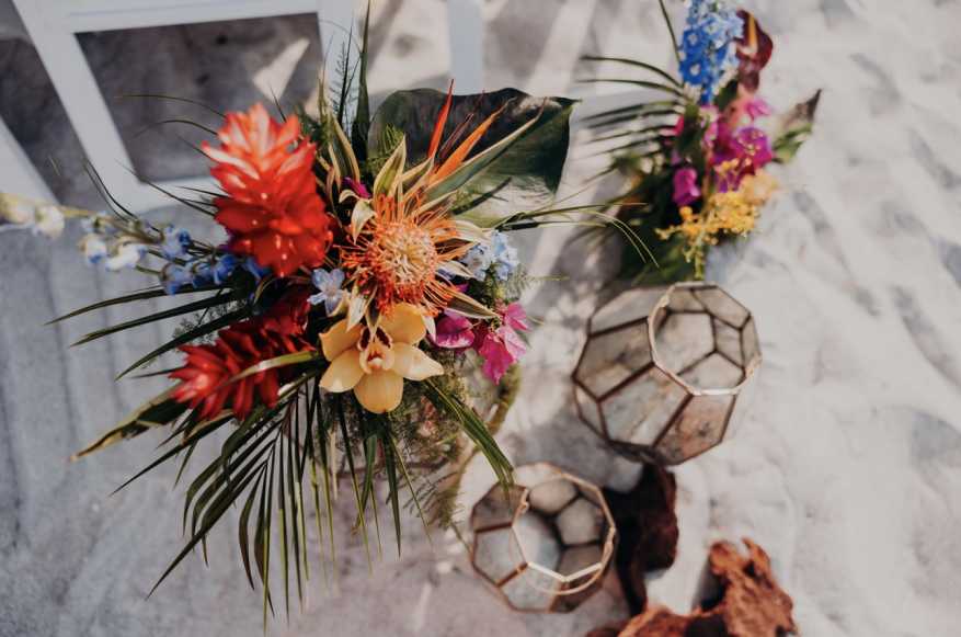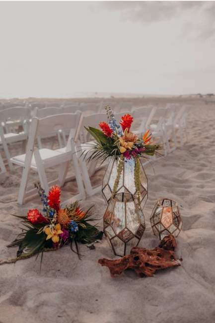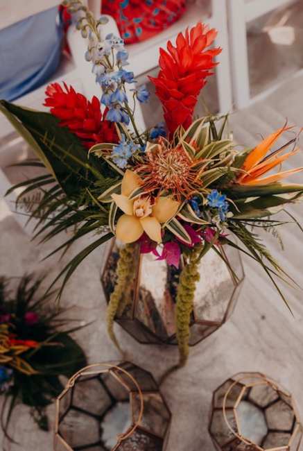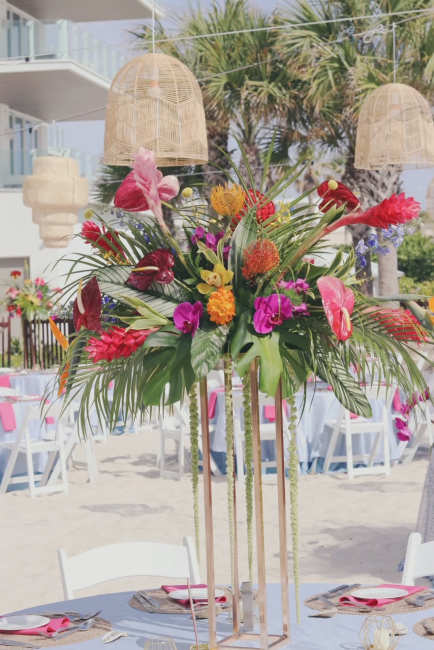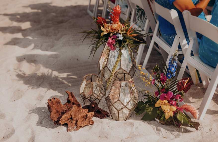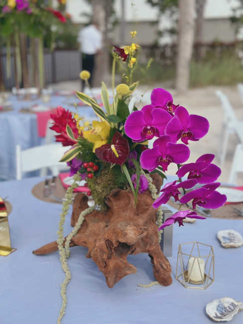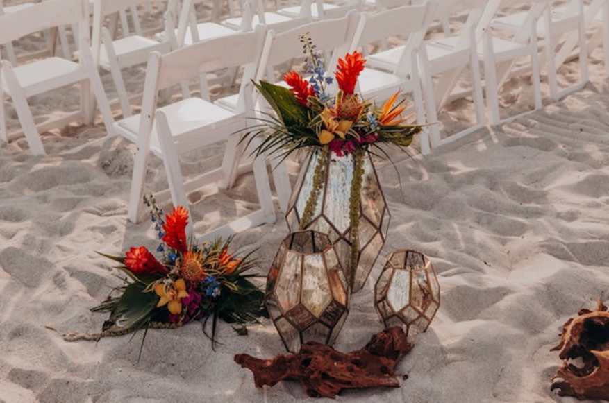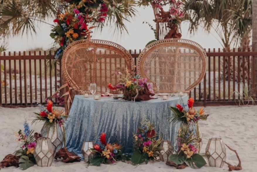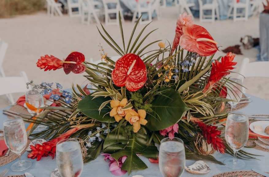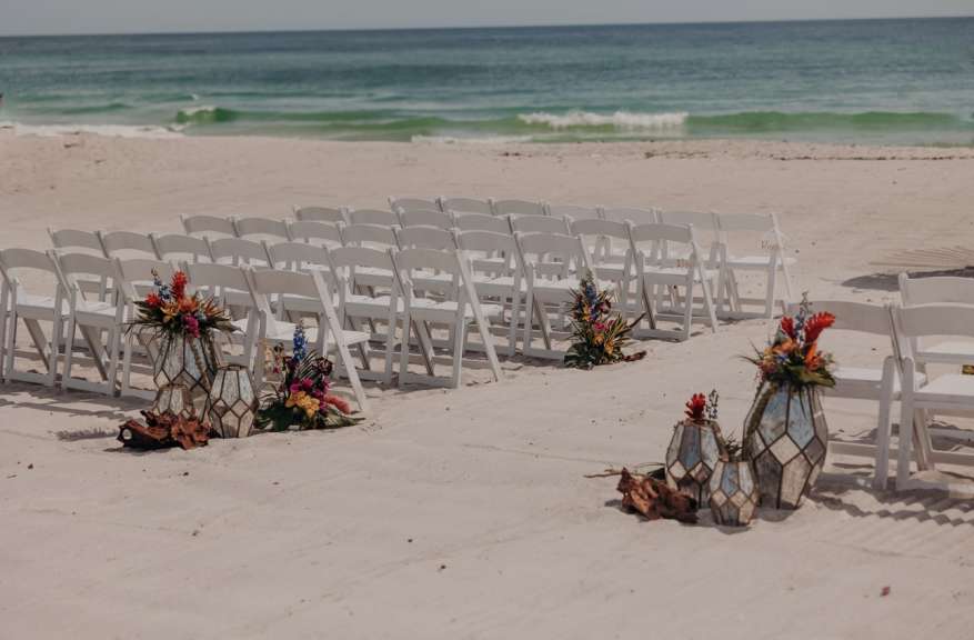 Venetian Flowers provided stunning fresh flowers and wedding rentals for Sara and Gerald's magical wedding at the breathtaking Zota Beach Resort on Longboat Key, Florida. The couple's special day was transformed into a tropical paradise with lush arrangements displayed on tall gold stands and unique tropical creations featuring driftwood accents. The wedding rentals from Venetian Flowers added an extra touch of elegance to the celebration. Rented peacock chairs provided a luxurious seating option for the newlyweds, while a shoe valet ensured guests could easily kick off their heels and dance the night away. Lanterns adorned with beautiful blooms added a romantic ambiance to the evening. Venetian Flowers' attention to detail and creativity truly made Sara and Gerald's wedding day unforgettable. The combination of fresh flowers, tropical accents, and elegant rentals created a picture-perfect setting for their special day at the Zota Beach Resort.