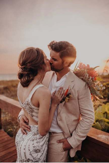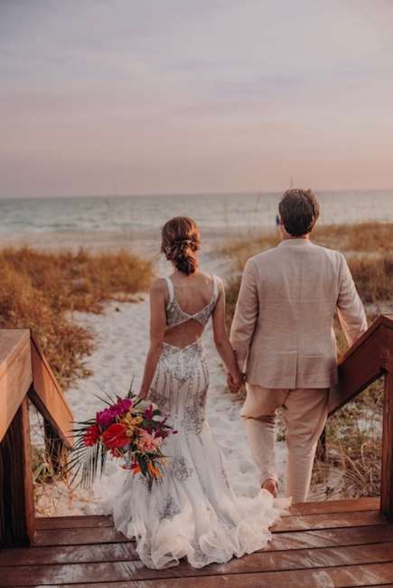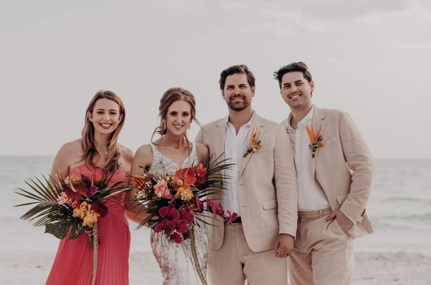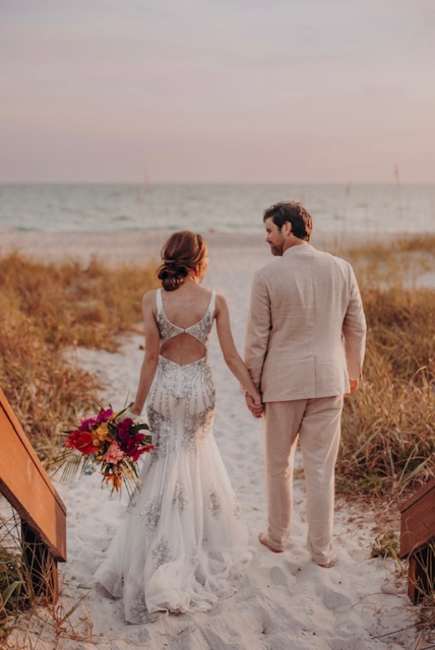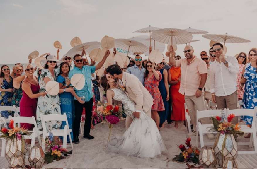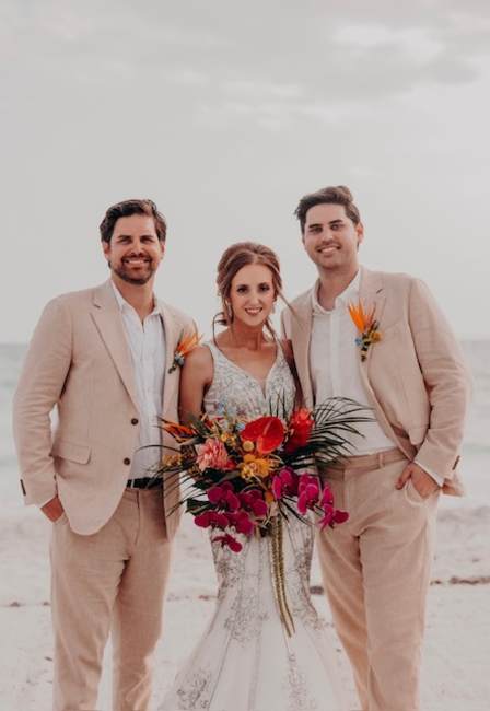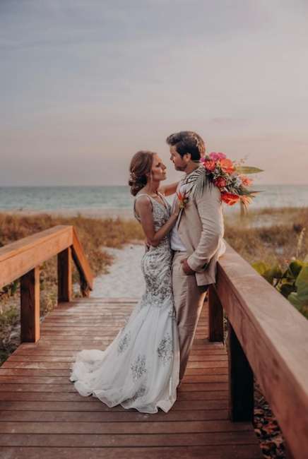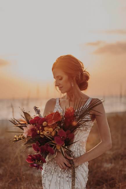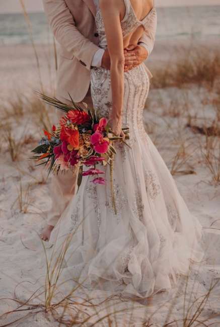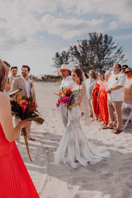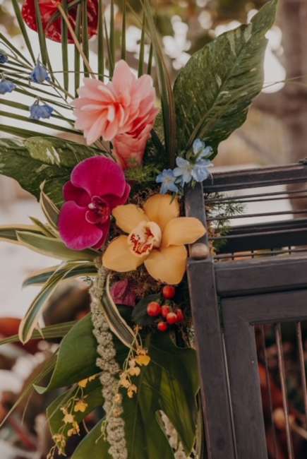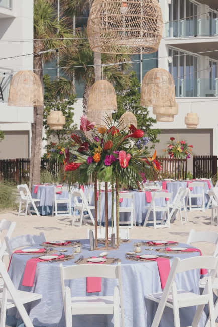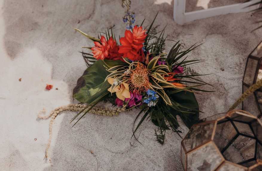 Venetian Flowers provided stunning fresh flowers and wedding rentals for Sara and Gerald's magical wedding at the breathtaking Zota Beach Resort on Longboat Key, Florida. The couple's special day was transformed into a tropical paradise with lush arrangements displayed on tall gold stands and unique tropical creations featuring driftwood accents. The wedding rentals from Venetian Flowers added an extra touch of elegance to the celebration. Rented peacock chairs provided a luxurious seating option for the newlyweds, while a shoe valet ensured guests could easily kick off their heels and dance the night away. Lanterns adorned with beautiful blooms added a romantic ambiance to the evening. Venetian Flowers' attention to detail and creativity truly made Sara and Gerald's wedding day unforgettable. The combination of fresh flowers, tropical accents, and elegant rentals created a picture-perfect setting for their special day at the Zota Beach Resort.